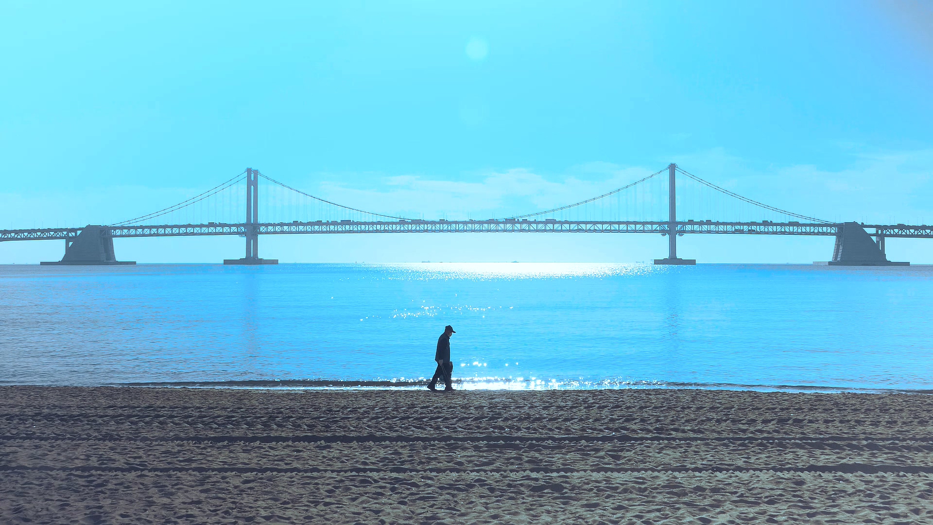 A. 운이 좋아서 구상하고 상상했던 장면을 아주 쉽게 얻을 수 있었습니다. 광안대교 위의 차 밀리는 것을 보면 알 수 있는데 촬영을 출근시간대에 했어요. 그 장면을 활용하고 싶어서요. 시간대 정도만 생각하고 장소로 갔는데, 아주 맘에 드는 상황이라 1시간 정도 만에 촬영이 마무리 되었어요. 물론 출근시간대가 지나고 나면 교통체증이 눈에 띄게 줄어들기에 어차피 다음 날을 기약해야 하지만, 다시 나오지 않아도 되겠다 싶었어요. 아마도 한 번에 성공하지 못했다면, 될 때 까지 매일 출근했을 수도 있어요. 광안리 해수욕장의 구조가 인도와 백사장 사이에 나무가 심어진 화단과 큰 턱처럼 내려가는 계단 같은 게 있어요. ‘데크’라고도 하죠. 화단에 걸터앉아 자리 잡으니 지나다니는 사람들이 완전 가깝거나, 멀거나 딱 구분이 되어 버리는 것도 현장에 나오기 전 약간 걱정과 우려했던 부분들이 애초에 발생할 수 없는 것이어서 아주아주 좋았고, 제가 그렇게 신경 쓰지 않아도 자연스레 이렇게 되는 것이 뭔가 다 딱딱 맞아떨어지는 것 같아 더 좋았습니다. 그래서 1시간 정도 만에 촬영이 마무리 되었어요. 그때 기억에 남는 것은 출근복장의 사람들이 생각보다 굉장히 많았어요. 누군가에게는 관광지이겠지만, 또 다른 누군가에겐 평범한 출근길. ‘그래도 우리는 오늘의 삶을 살아가고 있다.’ 라는 느낌이랄까요. 자전거를 타고 다니시는 분들을 봤을 때도 가벼운 운동 차림 보다는 등에 가방을 짊어지거나 핸들에 도시락 가방 같은 걸 걸고 가는 경우가 좀 더 많았다는 것이 신선했습니다.