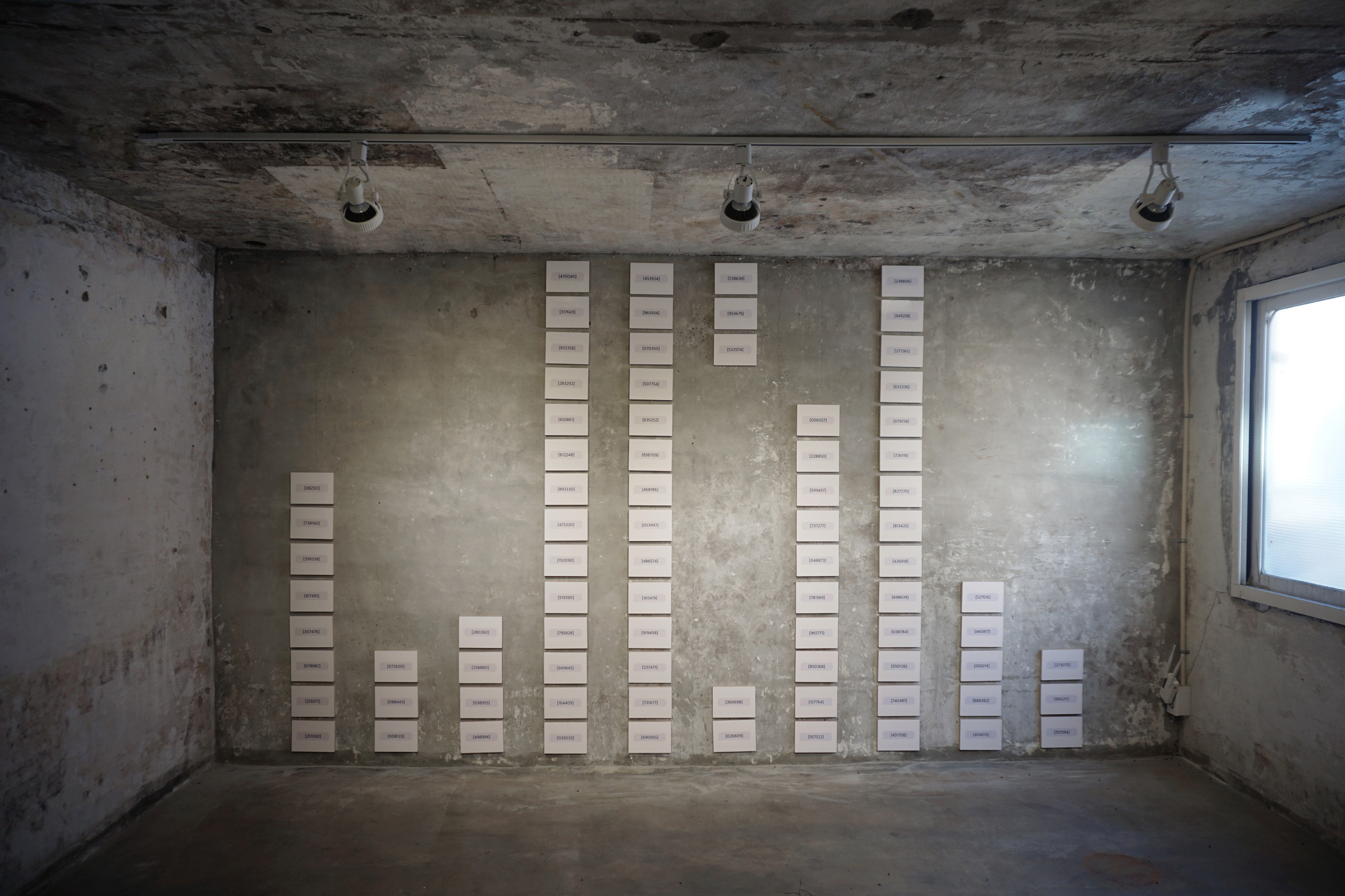 A. 아마도 불규칙해 보이는 것은 가장 개수가 많은 5월 때문일 것입니다. 저 때는 재난지원금 및 공모 신청이 몰려 있었던 시기로 기억됩니다. 벽면의 왼쪽부터 아래에서 위로 그래프처럼 차근차근 정렬된 1월~4월의 인증번호들과 다르게 한 줄 안에서 소화되지 못하고 천정을 찍고 내려와요. 6월부터는 또 개수가 작아지기도 했고요. 저는 설치 과정 중 즉흥적으로 결정하는 경우는 아주 드문 편인데, 이번에는 다른 분들의 의견을 반영하여 결정했어요. 일종의 재미 요소로 잘 나타난 것 같습니다.많은 사람들이 이와 비슷한 본인 확인의 과정들을 꽤 겪어보셨을 것이라 생각합니다. 공적인 행정 처리를 웹을 통해 진행하다 보면 하루에도 몇 번씩 이런 숫자들을 받아보거나, 그림을 선택하는 등의 절차를 거쳐야 하니까요. 우리는 태어나면서부터 이름 외에도 숫자를 통해 타인과 구분이 되고 있지요. 주민등록번호도 그렇고, 학교 입학 이후엔 학반이나 학번, 군 입대의 경우엔 군번, 직장에서는 또 다른 숫자를 부여받아요. 그리고 그것을 내가 나임을 증명하는 방법으로 활용하고요. 이런 부분들은 무의식적으로 지나칠 수 있는 부분이지만 제한시간 안에 입력해야 하는 무작위의 숫자 여섯 개는 참 다릅니다. 다른 숫자들 보다 대상을 장악하는 힘이 강력해요. 이 부분에서 지배당하고 있다는 느낌을 크게 받게 되고, 이 생각이 작업으로까지 이어졌습니다.